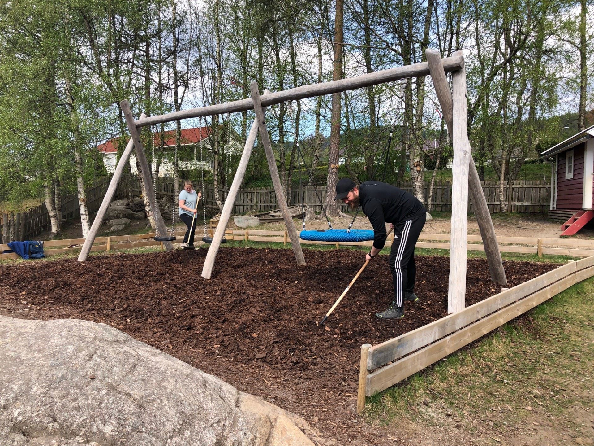 Det var hovudsakleg uteområdet som fekk seg eit løft denne dagen. Det blei lufting av bark, raka, saga, vaska, skrubba, kosta og kasta i stort monn! Og arbeidsinnsatsen blei premiert med nydeleg pastasalat og deilig sjokoladekake. Denne duganden skulle eigentleg vere i mars, men blei avlyst på grunn av snøfall. I mai venter det nye dugnadsoppgåver og felles innsats for eit godt barnehagemiljø. Tusen takk til alle som stilte!