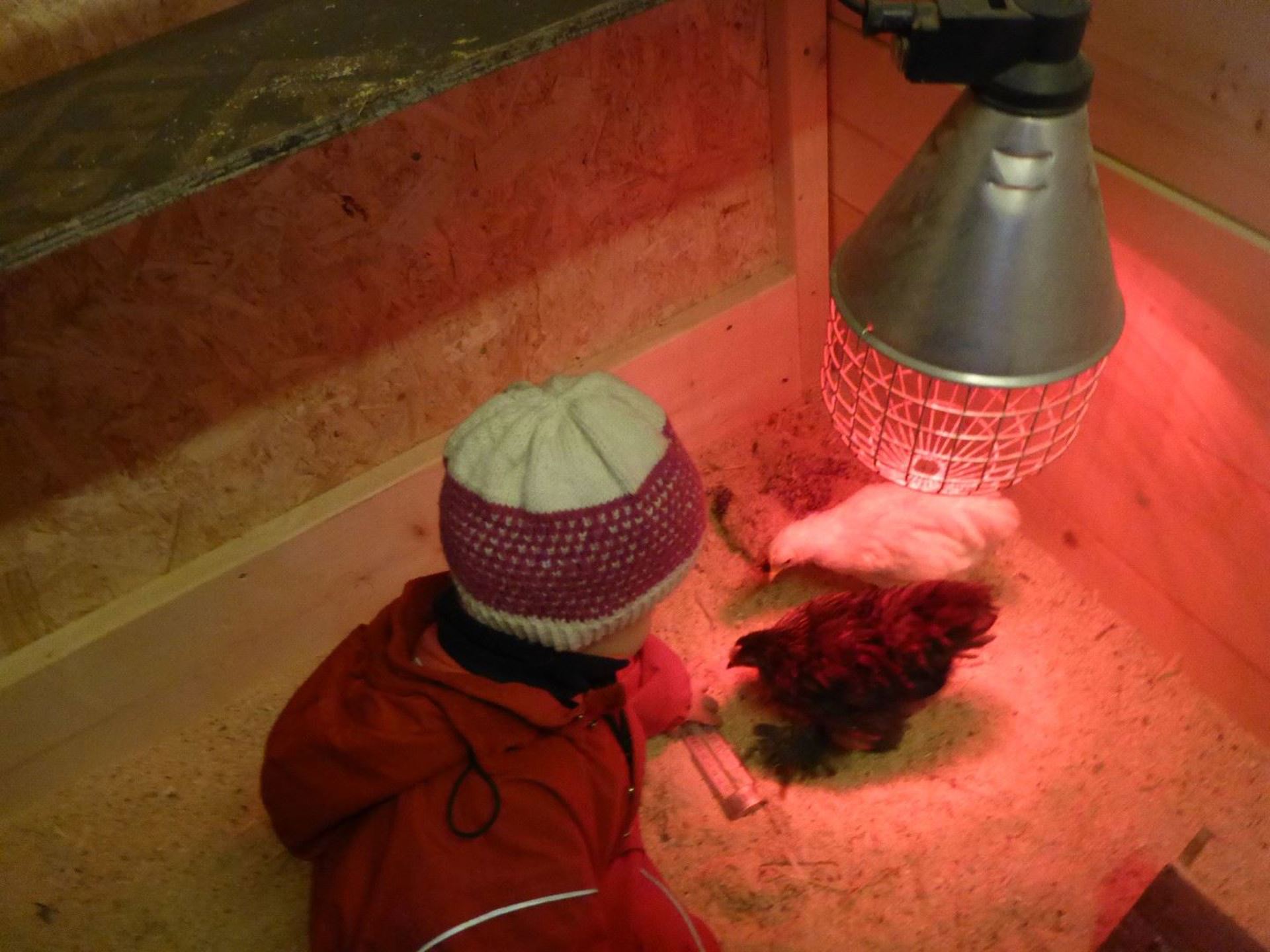 Kyllingane stortrivst med større plass å boltre seg på. Her har dei besøk av dei yngste barna i barnehagen, og det er stas når vi får komme så nær som dette. I løpet av nokre dagar vil desse to få fire nye venner. Vi skaffar oss fleire kyllingar, og då blir det endå fleire å passe på og ha omsorg for.